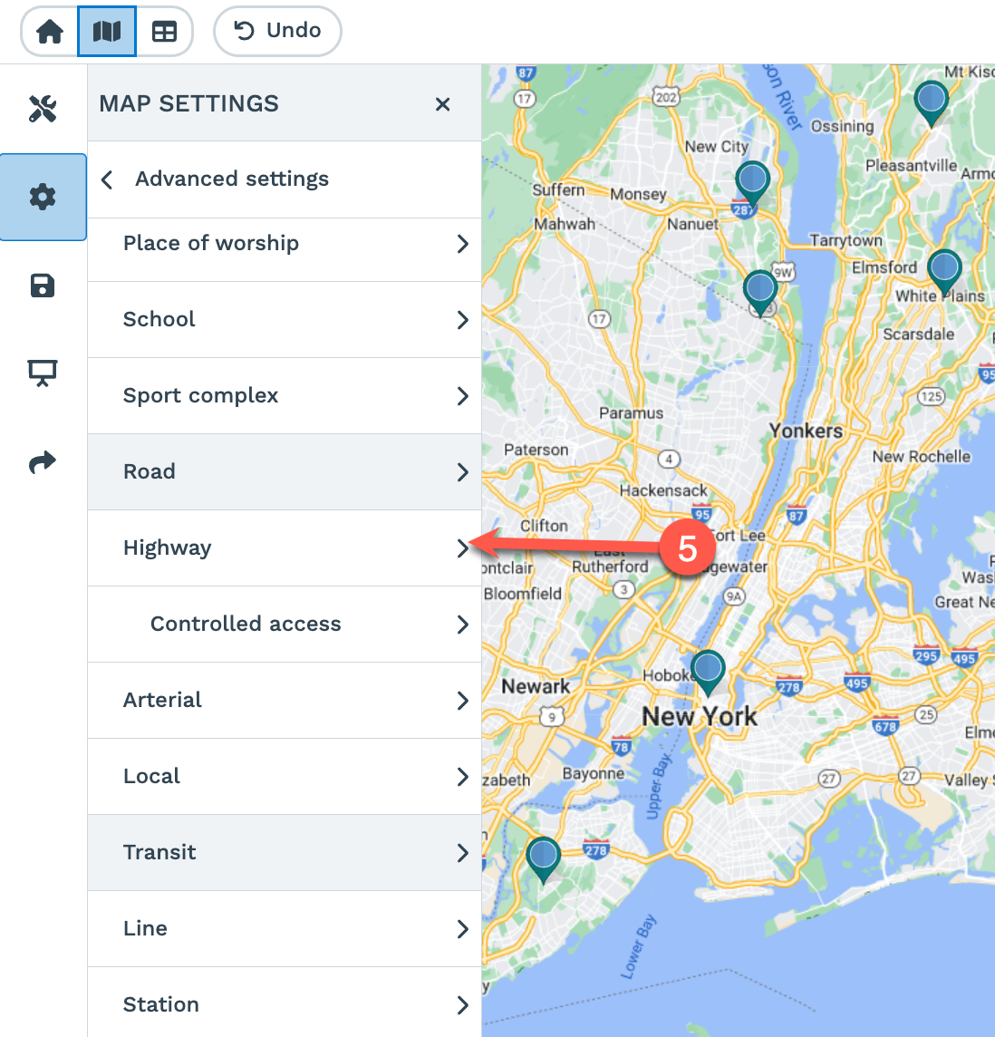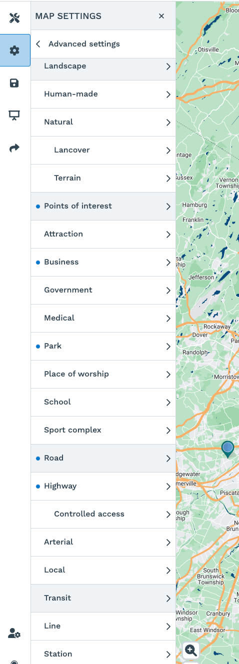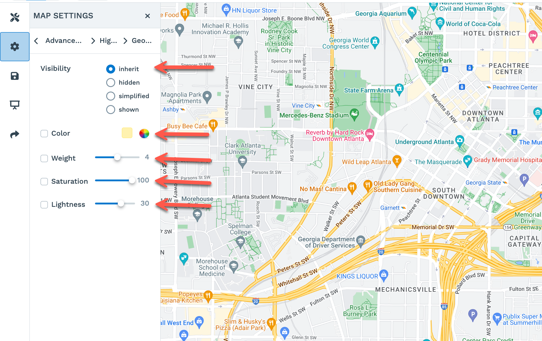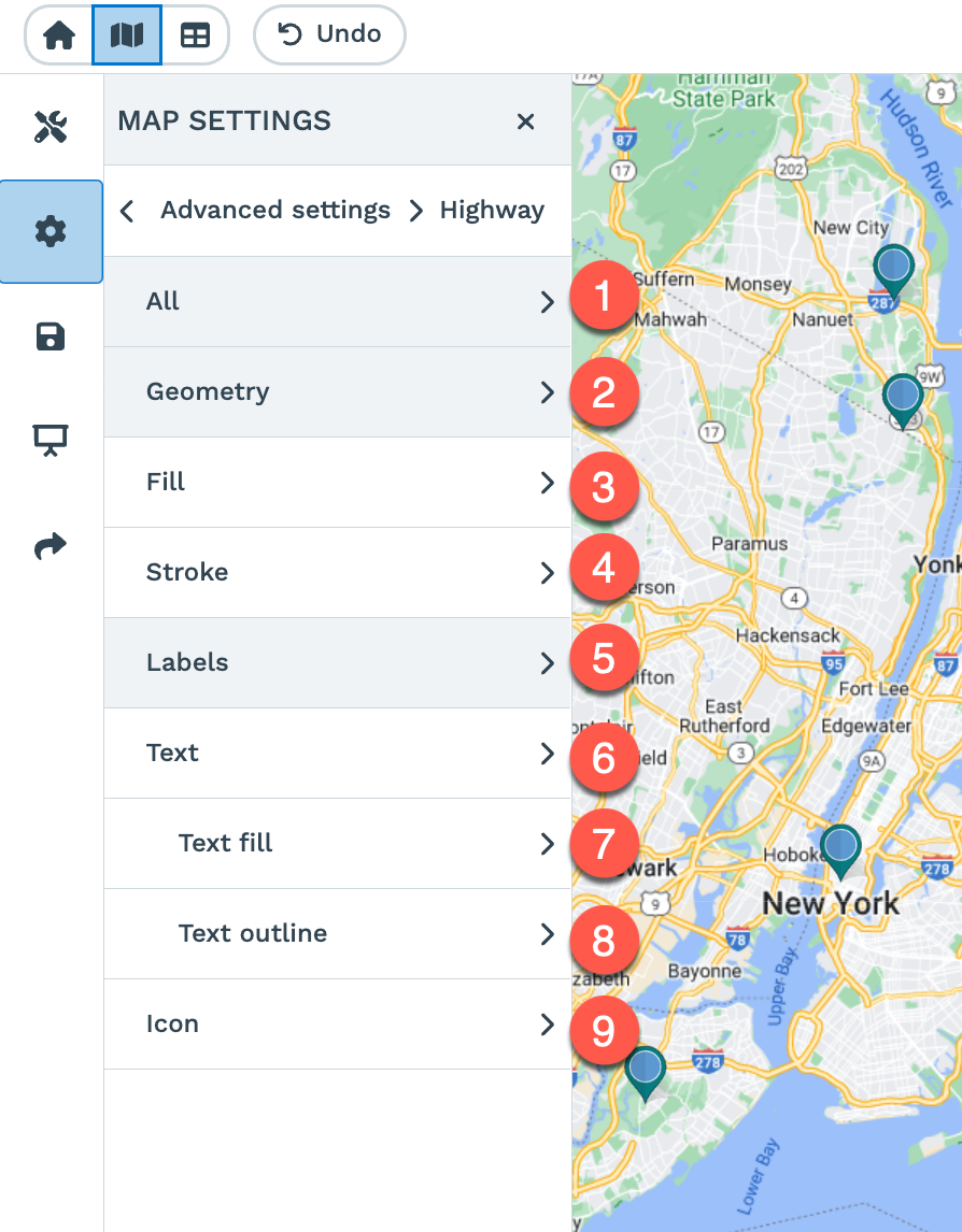 Step 6: Choose the feature you would like to modify. Below are the advanced customization options you'll see to modify how your maps appear:
