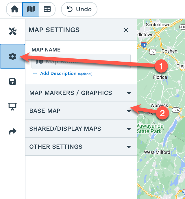 Step 1: Open your map and then open the 'Map Settings' window by clicking on the gear wheel icon in your map's upper left-hand corner.