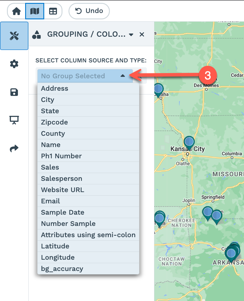 Step 3: Select the column in your data set that you want to "group by" and display it as different colored markers on the map.