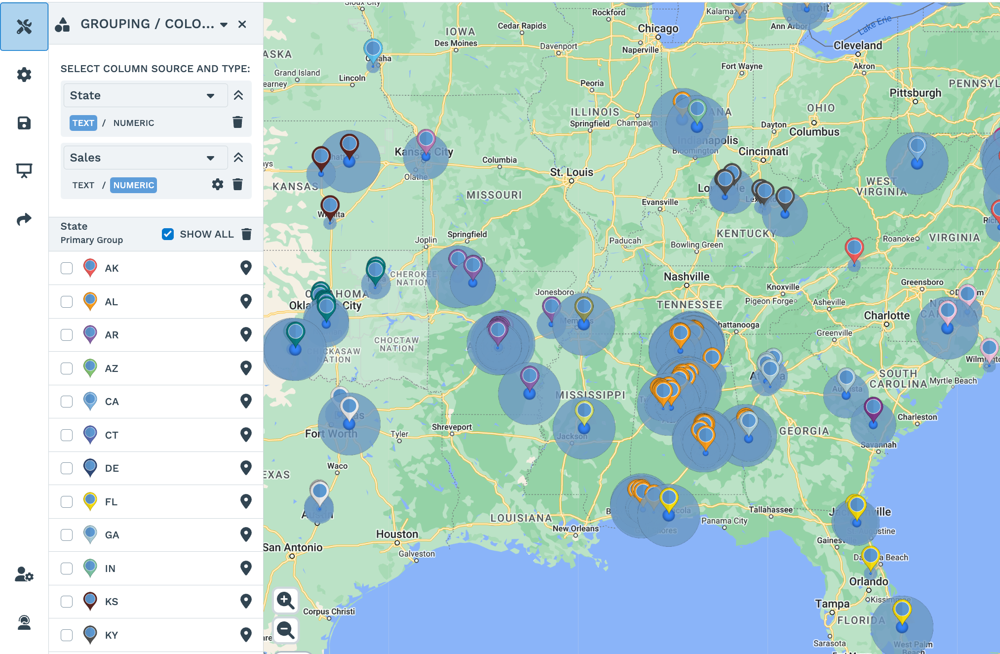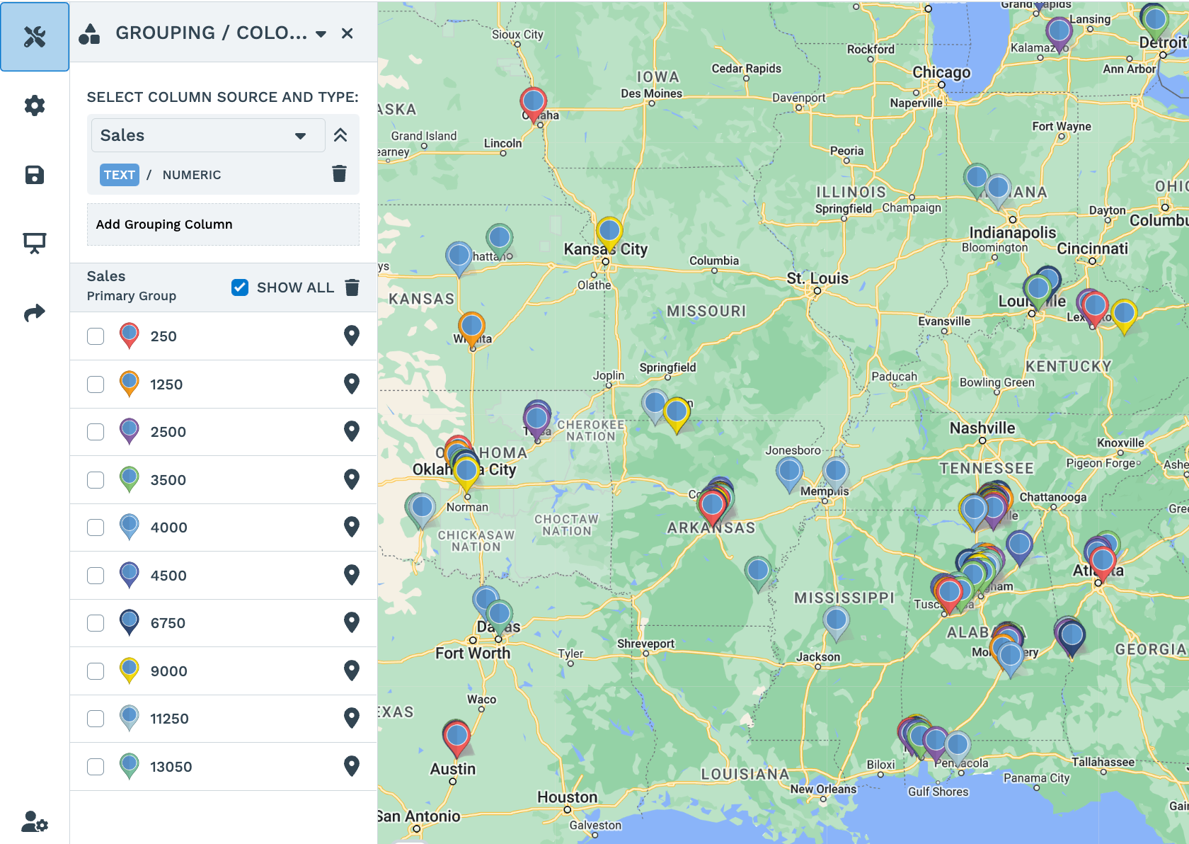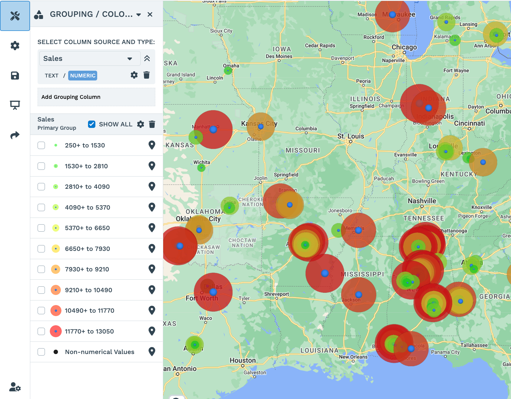 The grouping tool allows you to group and display by any column of your data so that each group shows up on the map with different color markers. You can also group your data by numerical value ranges so that each range shows up with a different color and size marker. Just follow these steps to use the tool: