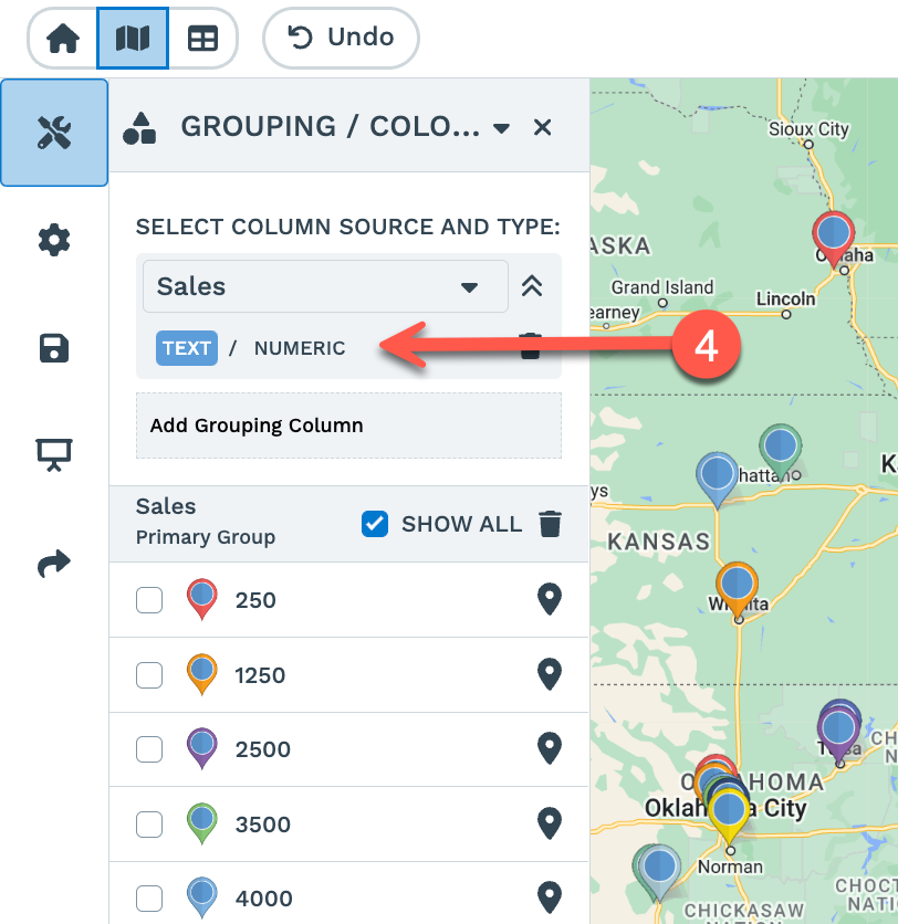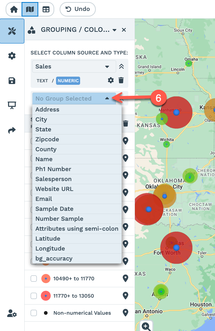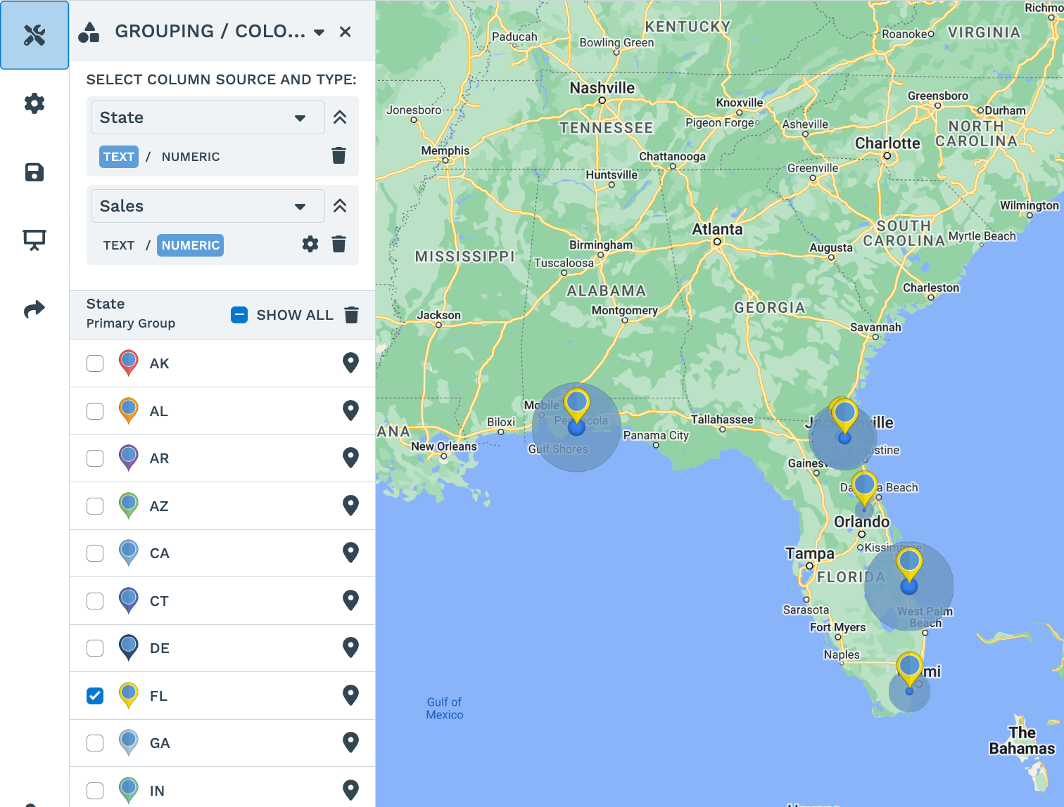 The grouping tool allows you to group and display by any column of your data so that each group shows up on the map with different color markers. You can also group your data by numerical value ranges so that each range shows up with a different color and size marker. Just follow these steps to use the tool: