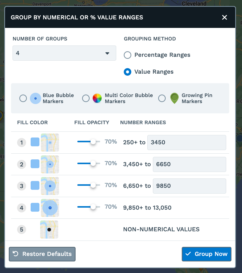 This will bring up a popup that lets you customize the ranges, select how many groups you want, group by percentages or number ranges, choose between different marker options - standard Blue bubble markers, Multi color bubbles, or Growing pin markers - all with the option to modify the fill color for each range.