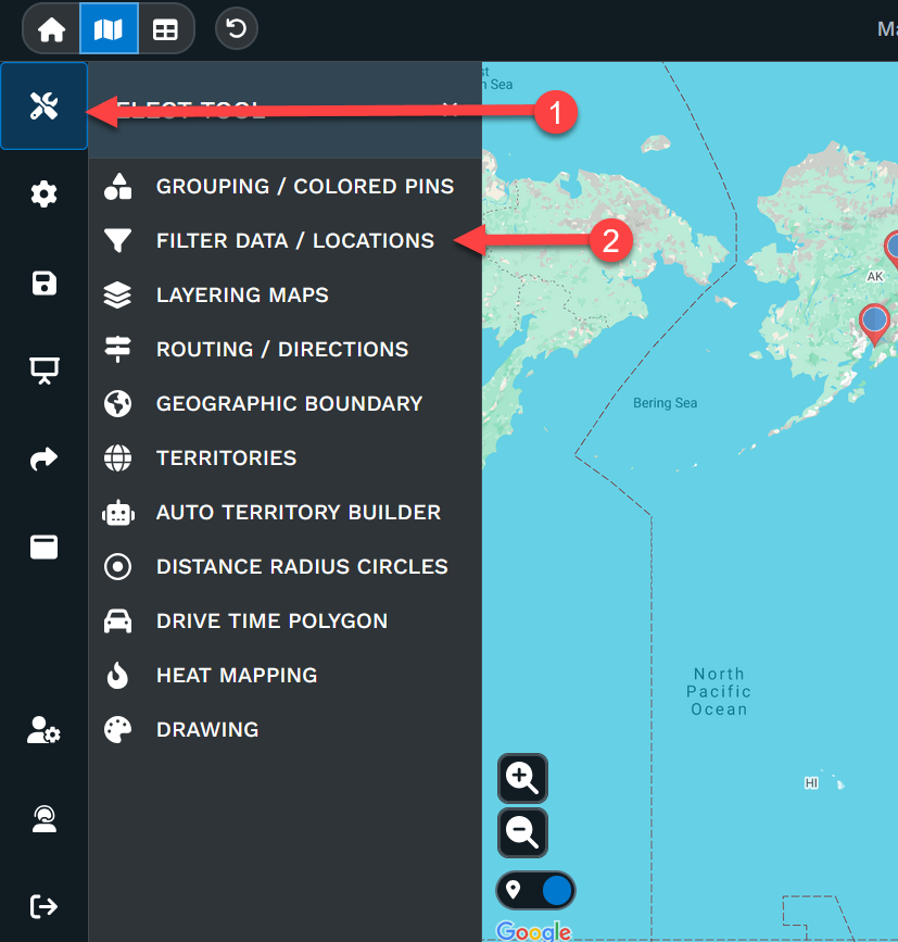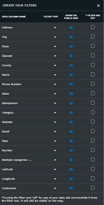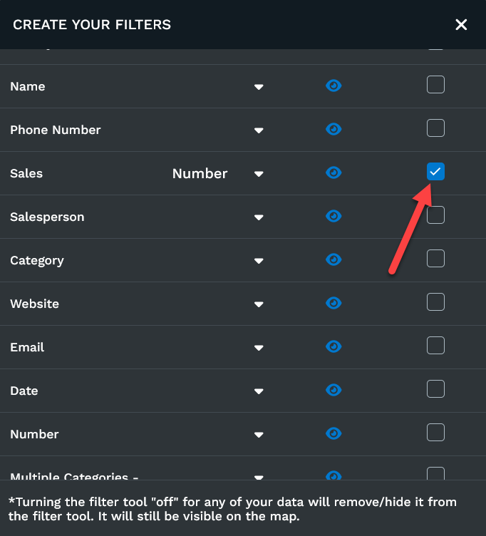 The Filter Tool allows you to segment your data and view it at multiple levels of granularity on a single map. It makes it easy to see relationships between data points while paring down heavy spreadsheet data to only what you want to see. To use the Filter Tool, follow the steps outlined below: