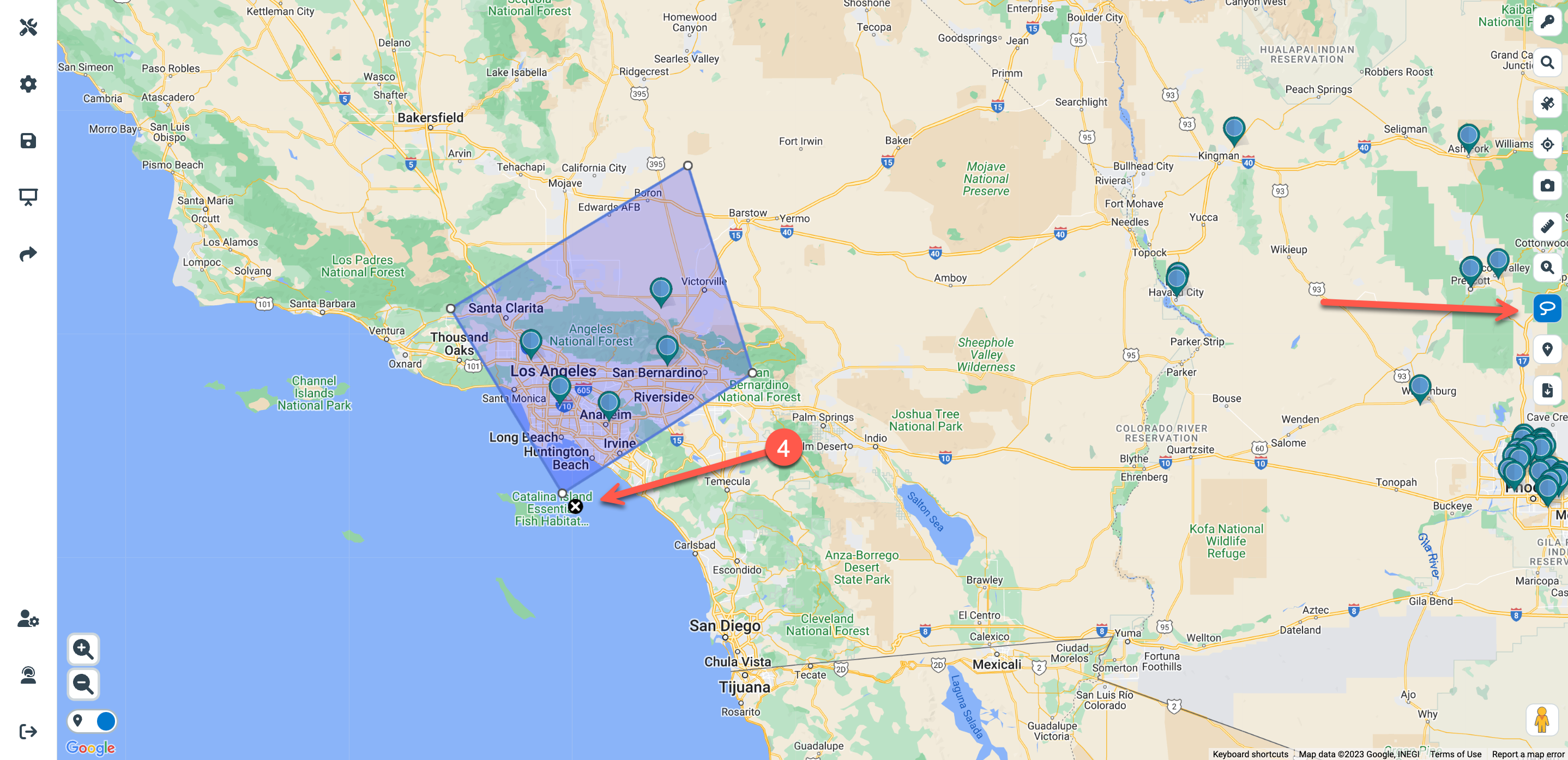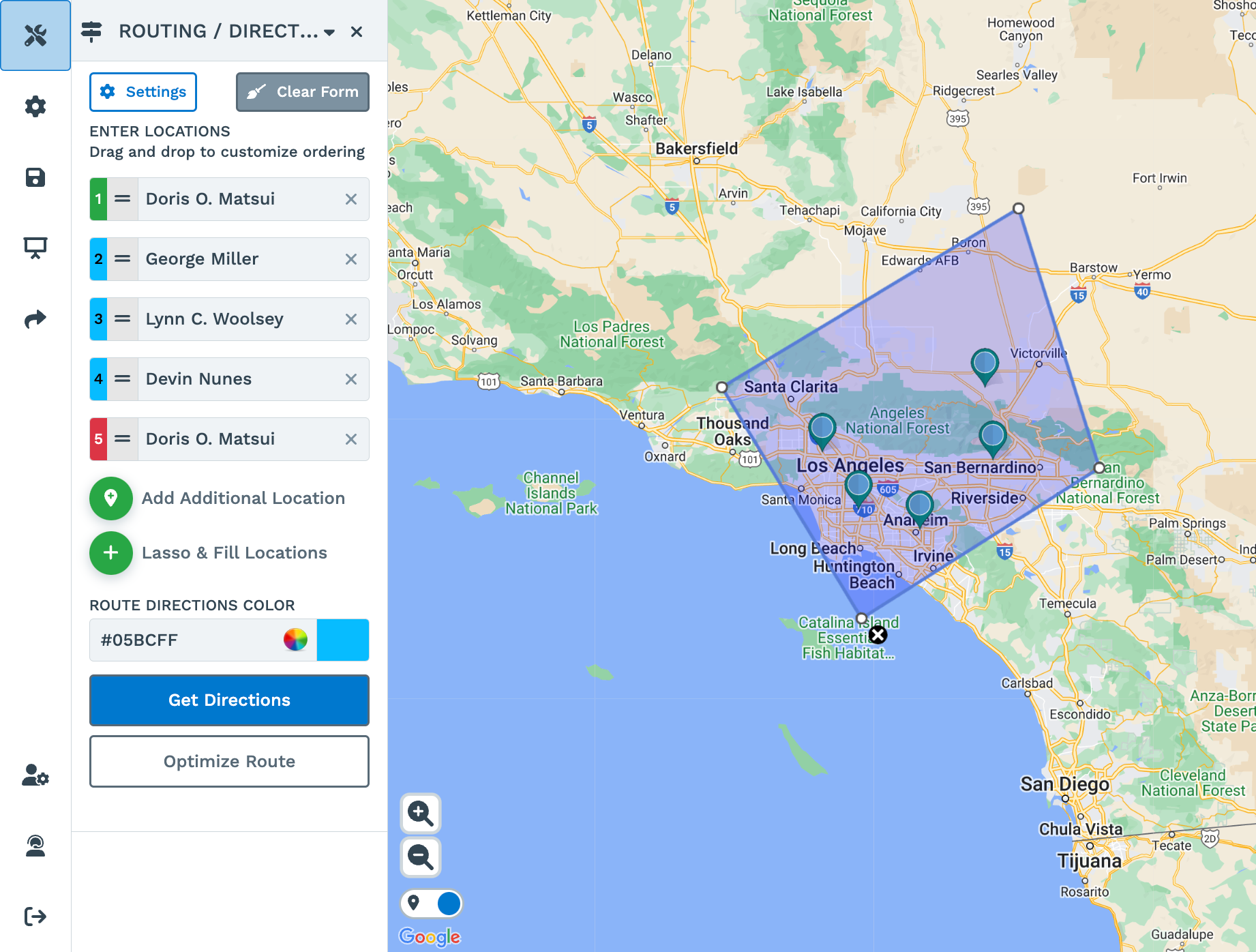 The Lasso Tool allows you to draw a polygon on the map and then interact with the markers or boundaries inside the area drawn. You can export those markers as an excel, Optimize a Route to all of them, Delete Them, Edit the Data as a Group, or Export Boundaries like zip codes from inside them.