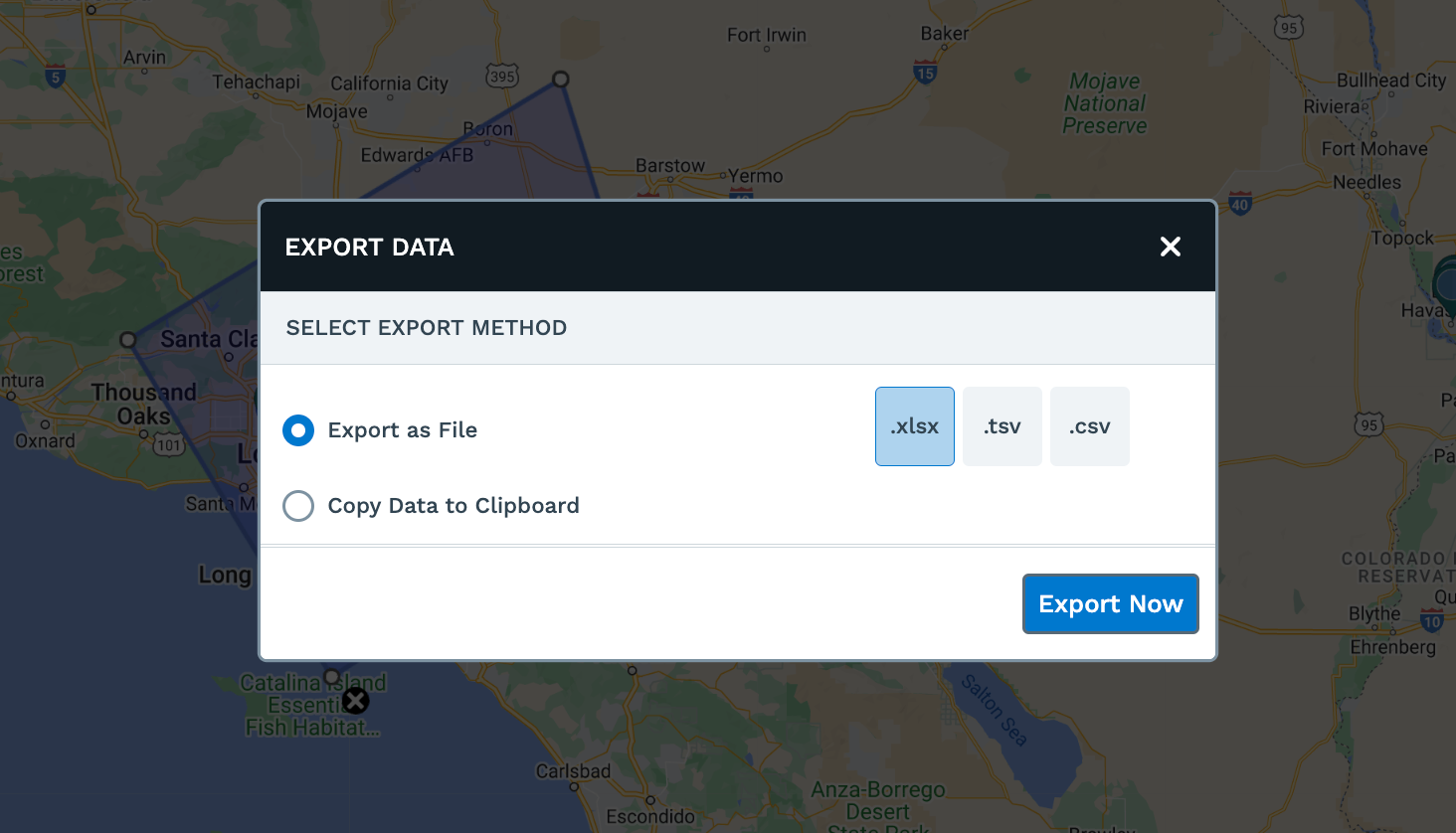 Option A: Export location data to a file. This will export the rows of your data that fall inside the shape you drew. You can choose the file format from the available options or even Copy the data to Clipboard.