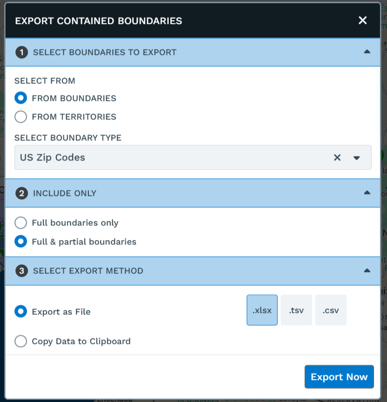 Option D: This allows you to export all boundaries in a given area like zips, cities etc, including those you have not imported into your map. You can export them from the given boundaries or from your created territories.
