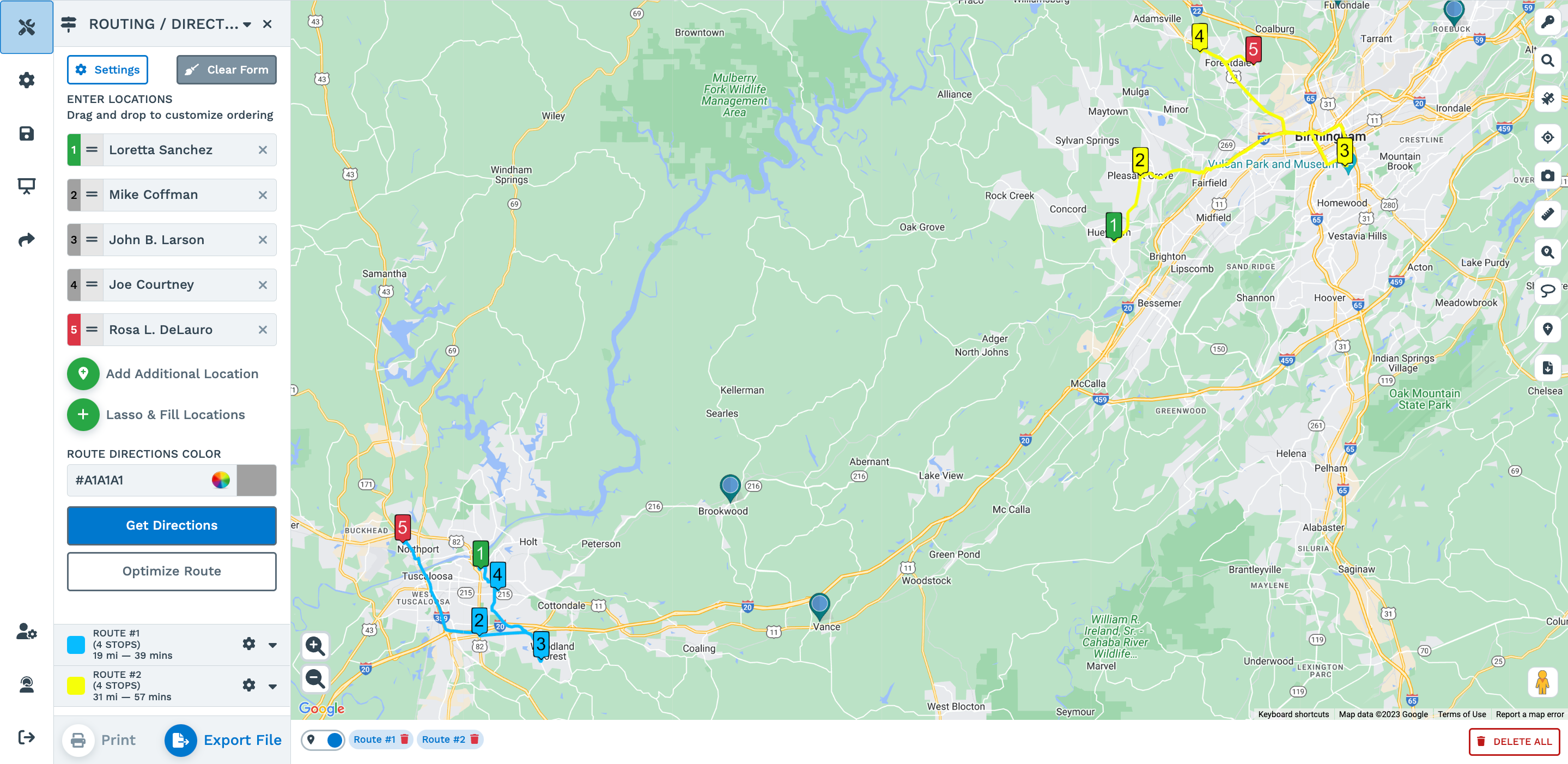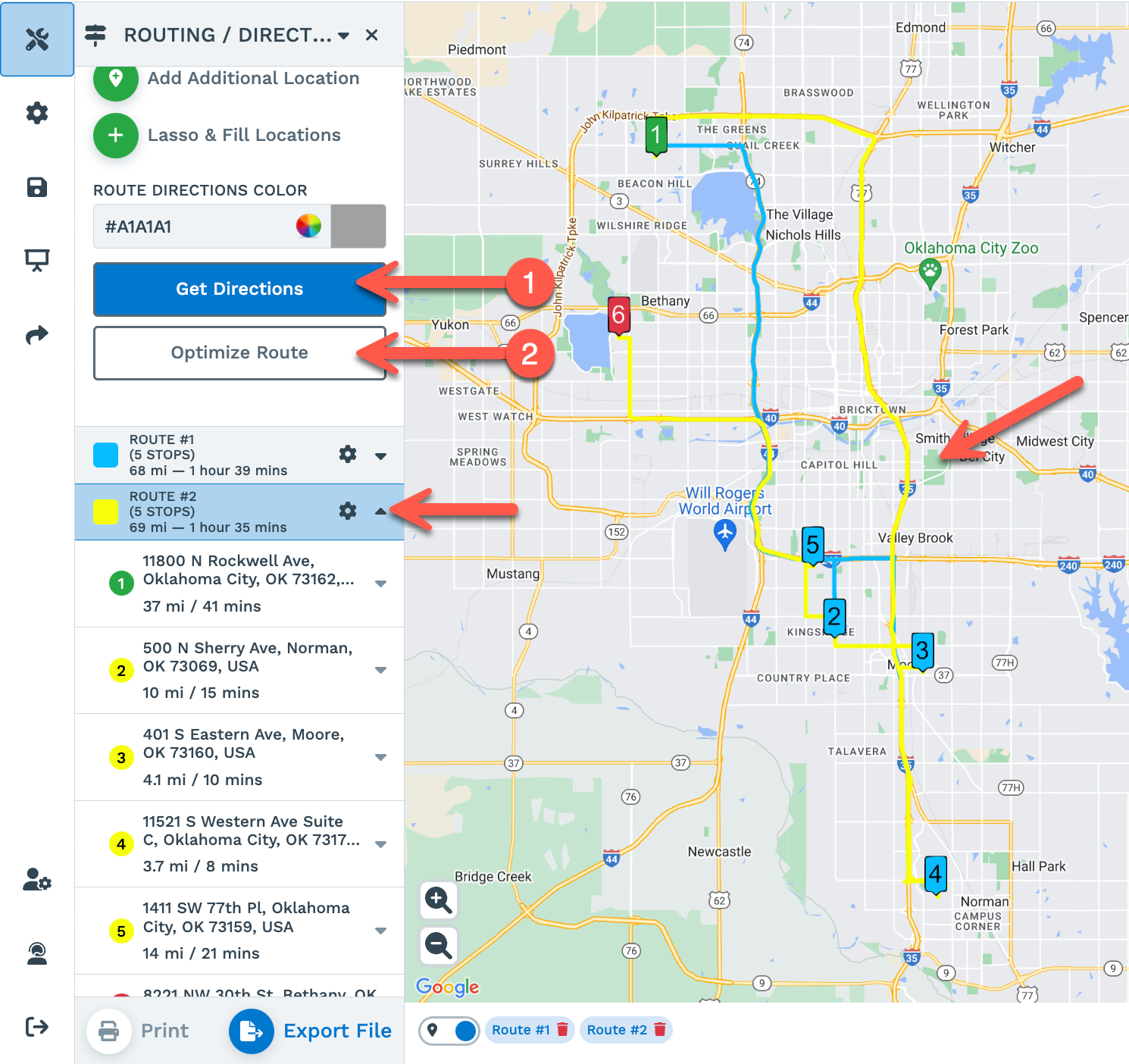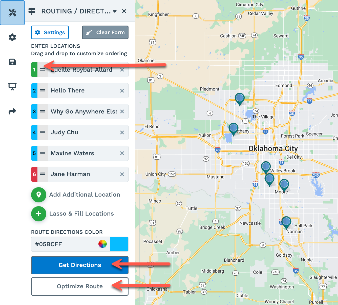 Step 4: Drag and drop the locations to rearrange the sequence if you want, then click on "Get Directions" and/or "Optimize Route" for your lassoed locations.