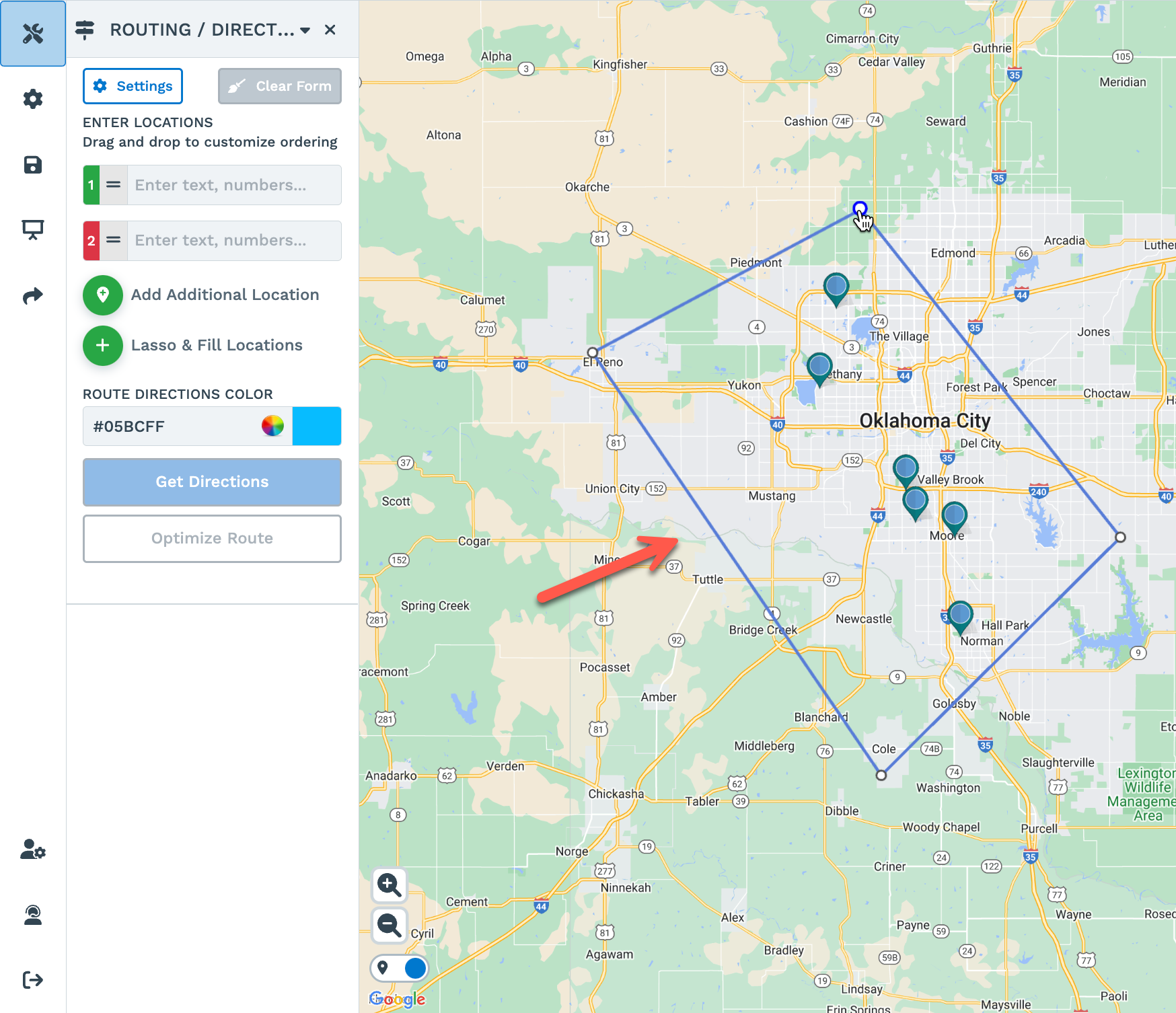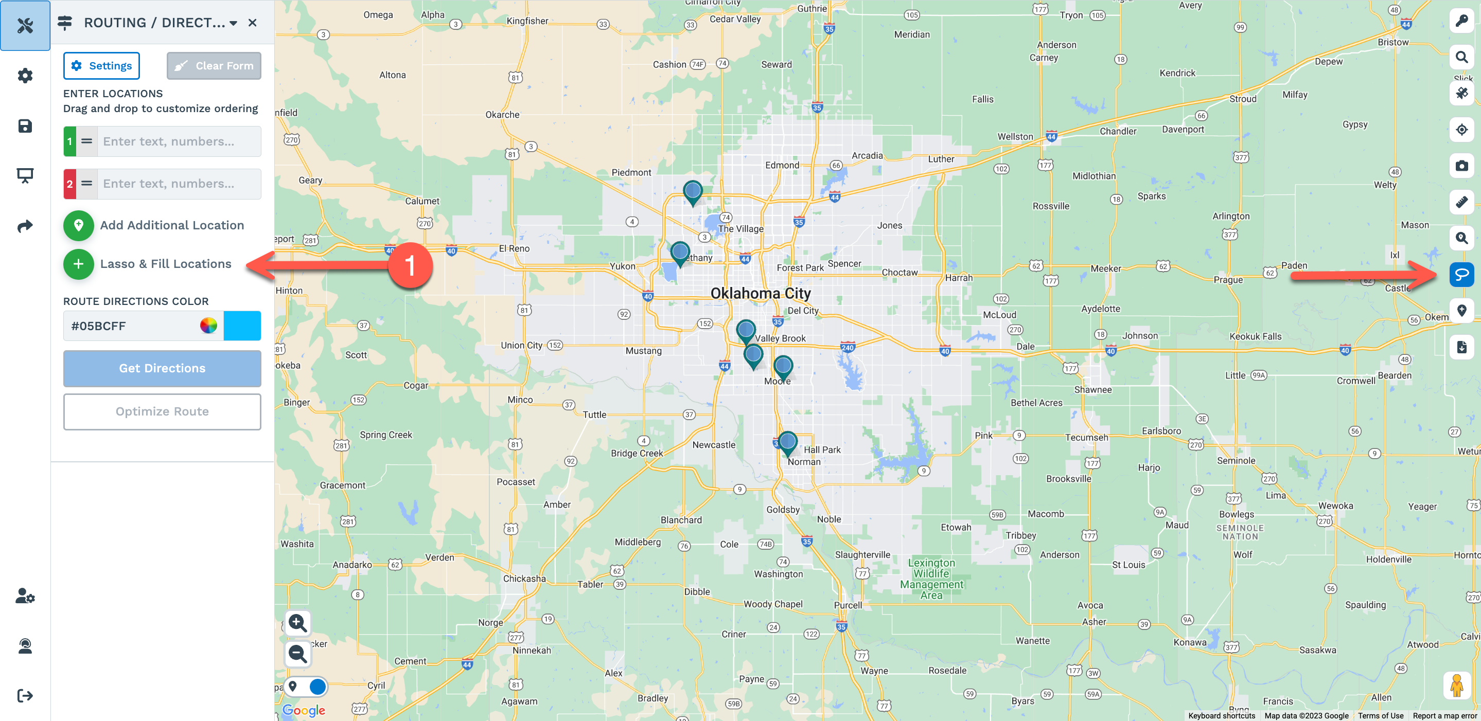 Step 1: Click on the Lasso & Fill Locations on the left-hand panel of the Routing / Directions Tool.