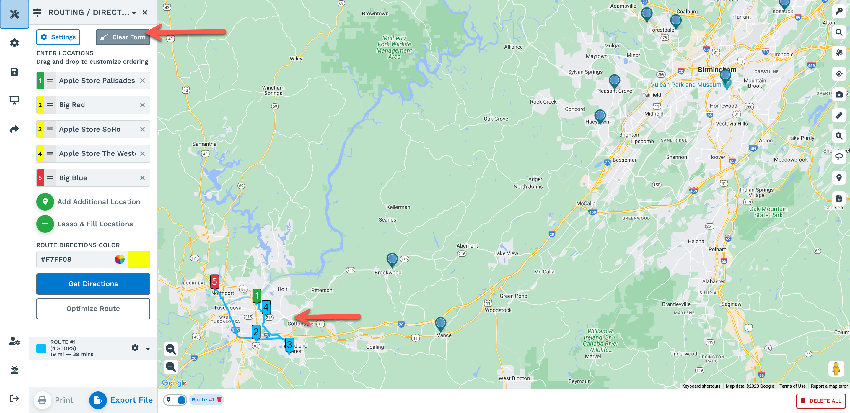 Step 1: Once your first set of directions is on your map, click 'Clear Form' on the top-left side of the Routing/Directions Tool panel.