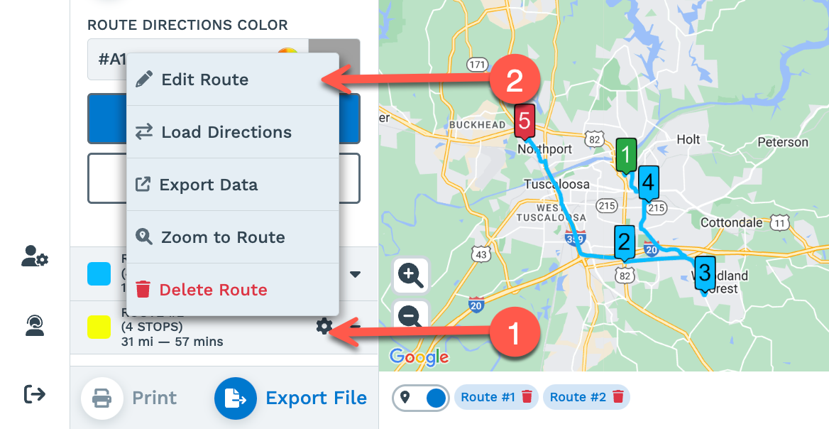 To edit the Route color and name, click on the 'Settings' icon next to the route you want to make edits, then select 'Edit Route.'