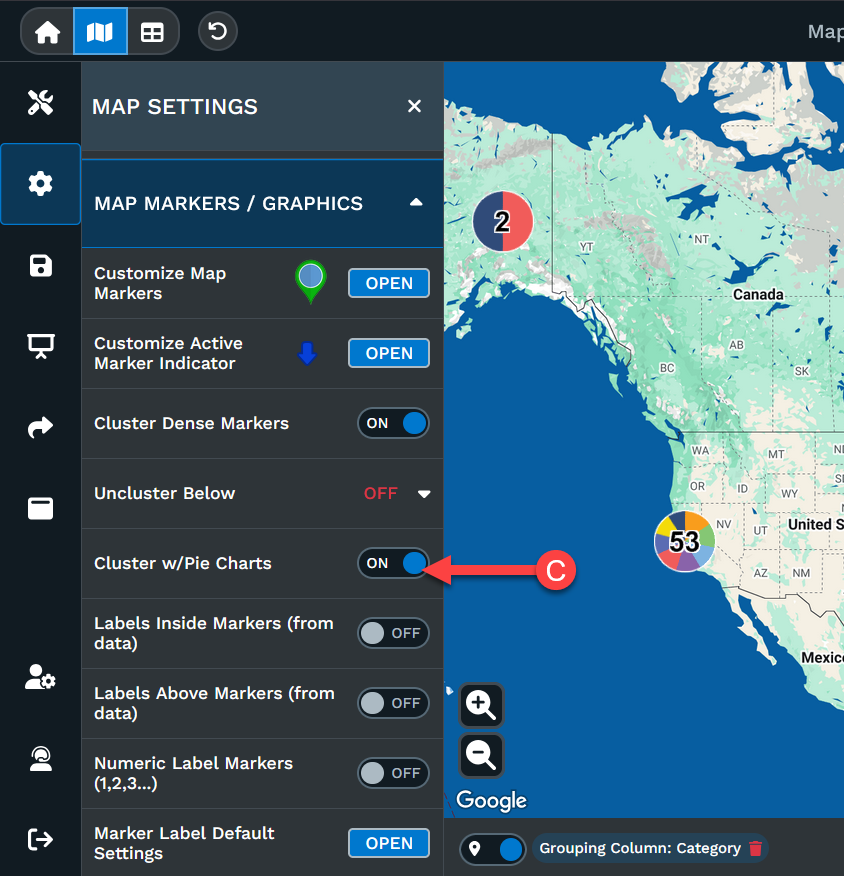 Option C: If you are clustering and using the Grouping Tool you can see those clusters as pie charts instead of just blue circles.