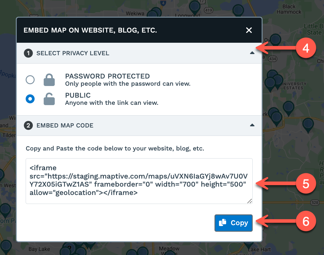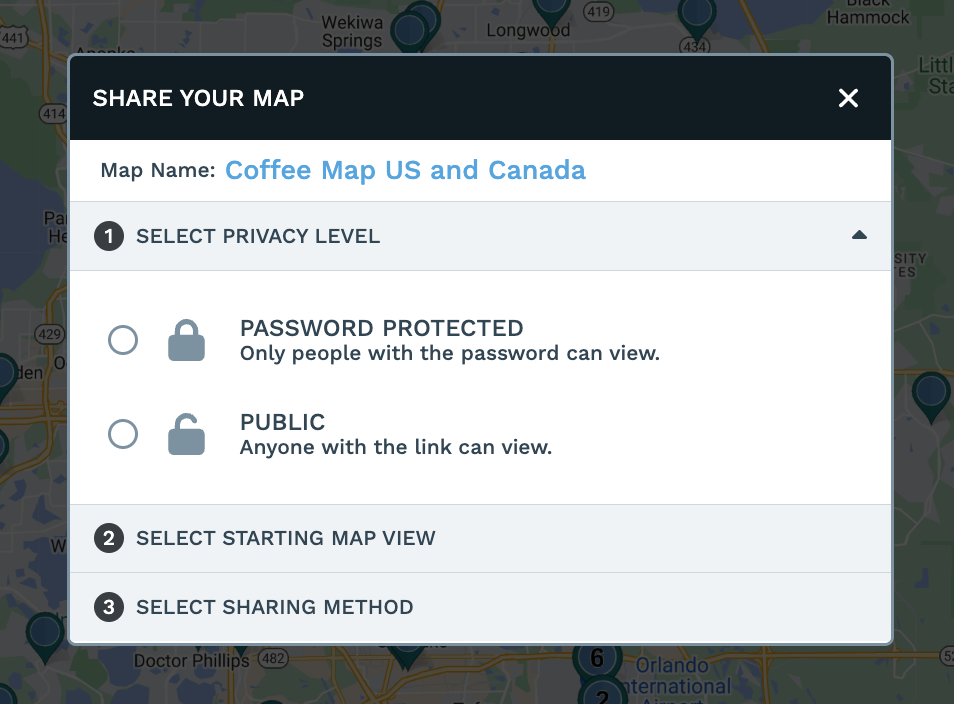 Once you make a selection, you'll be able to access the sharing method for your Map.