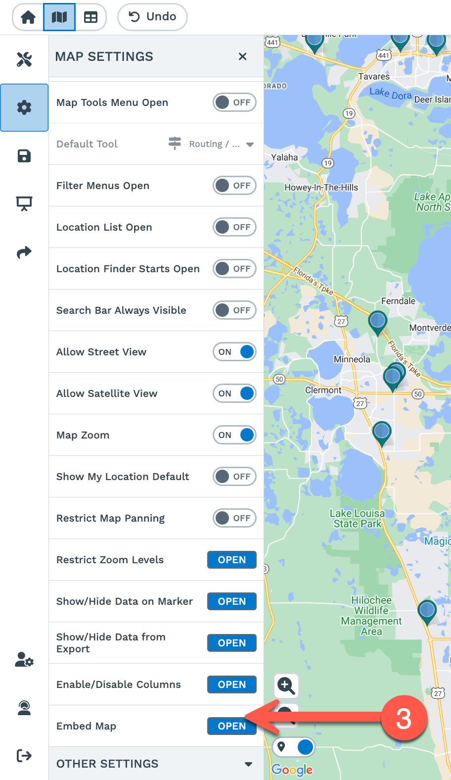 Step 3: Scroll down to locate and click on the 'Open' button next to the Embed Map option found on the menu.