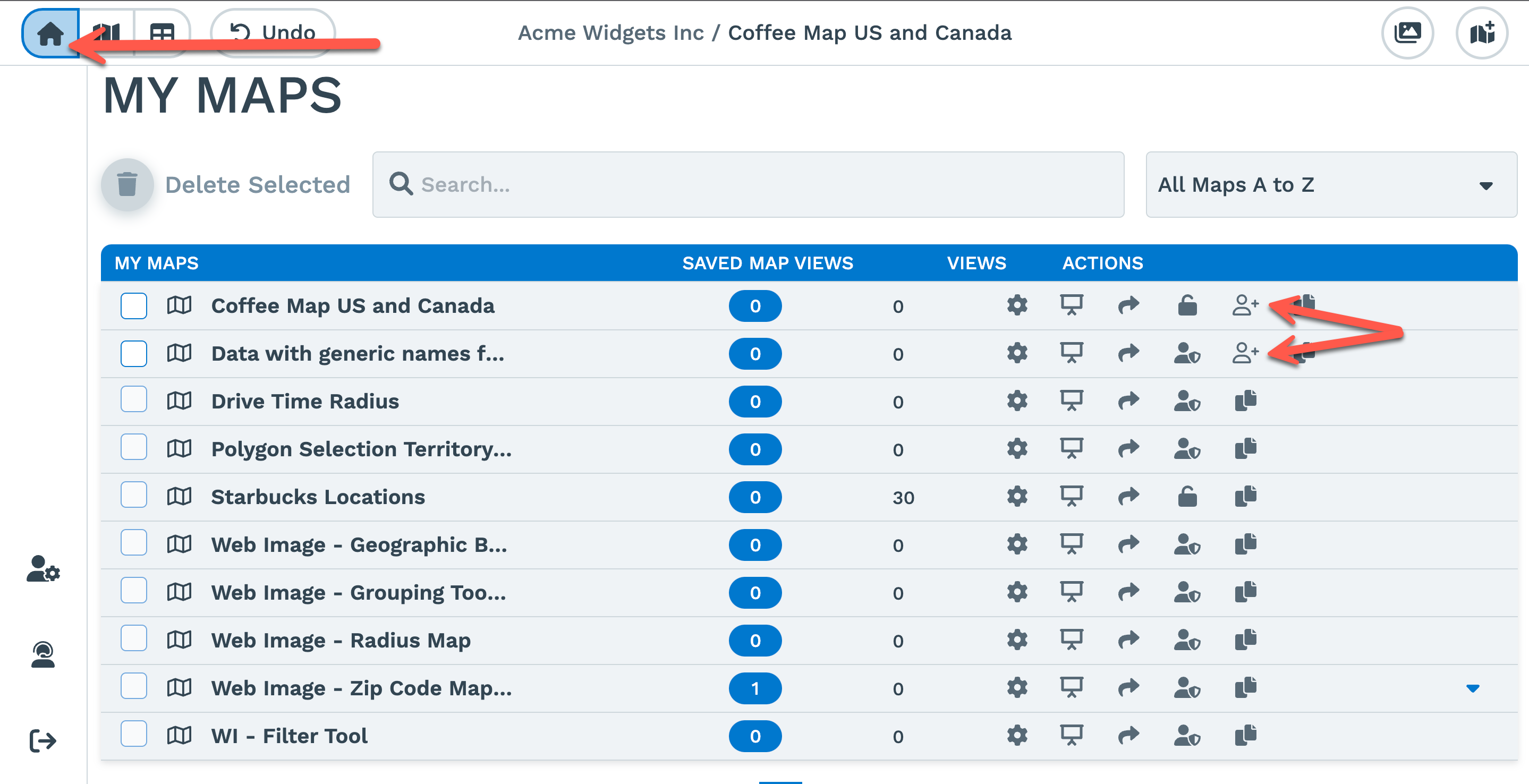 Clicking on the Share Map button next to each map will allow the owner of the map to give access to any of their team members by just selecting or entering their name/email address.