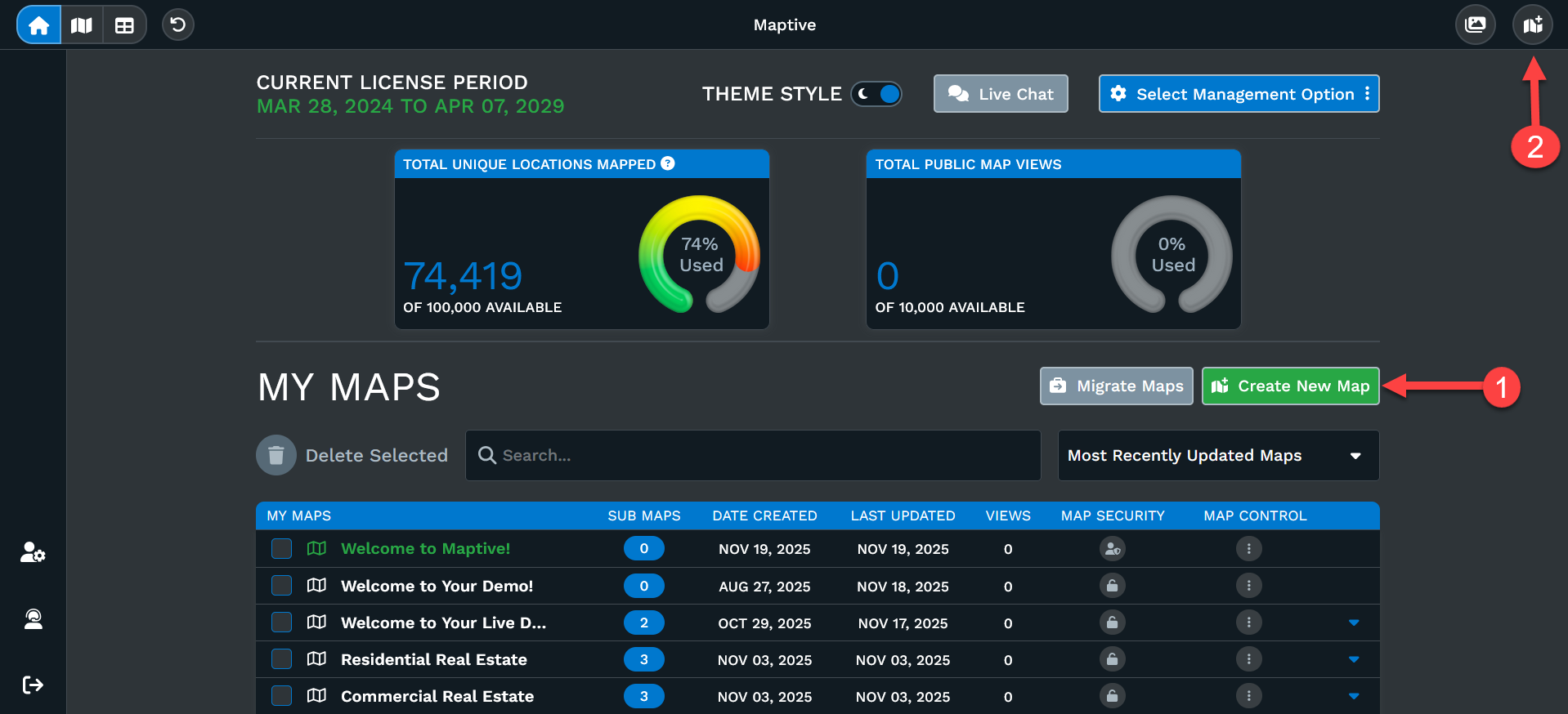 Option 1: Click 'Create New Map' on the upper right-hand side to get started.