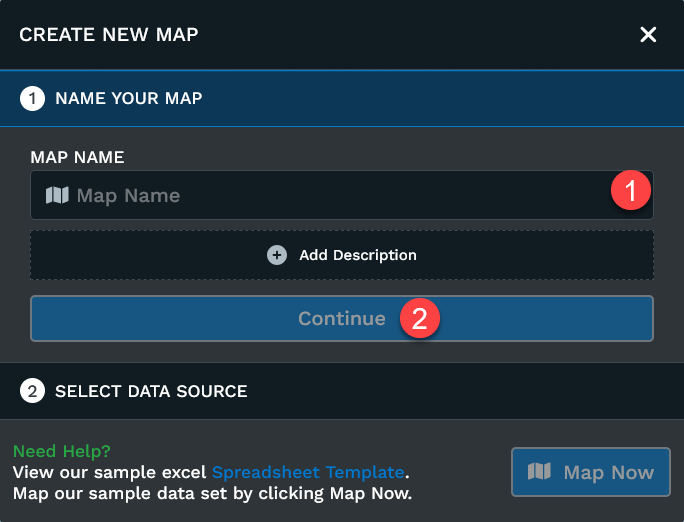 Once you click one of the options, a dialog box will appear where you can (1) name your new map and write a brief description (optional). (2) Click the 'Continue' button when ready.