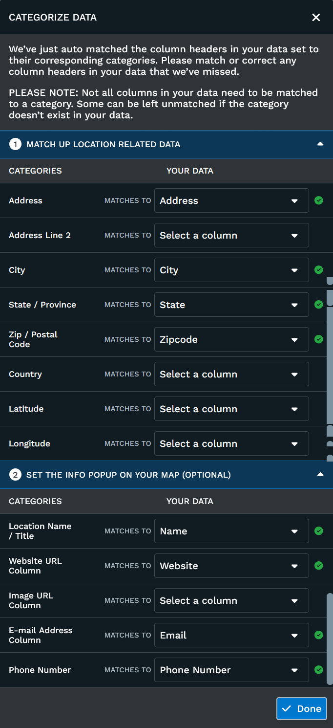 Before You're Finished: After uploading your data, a dialog box may appear. The program will do its best to recognize your address specific columns and match them up automatically, if the system didn't find what was needed . Help With Categorizing Data