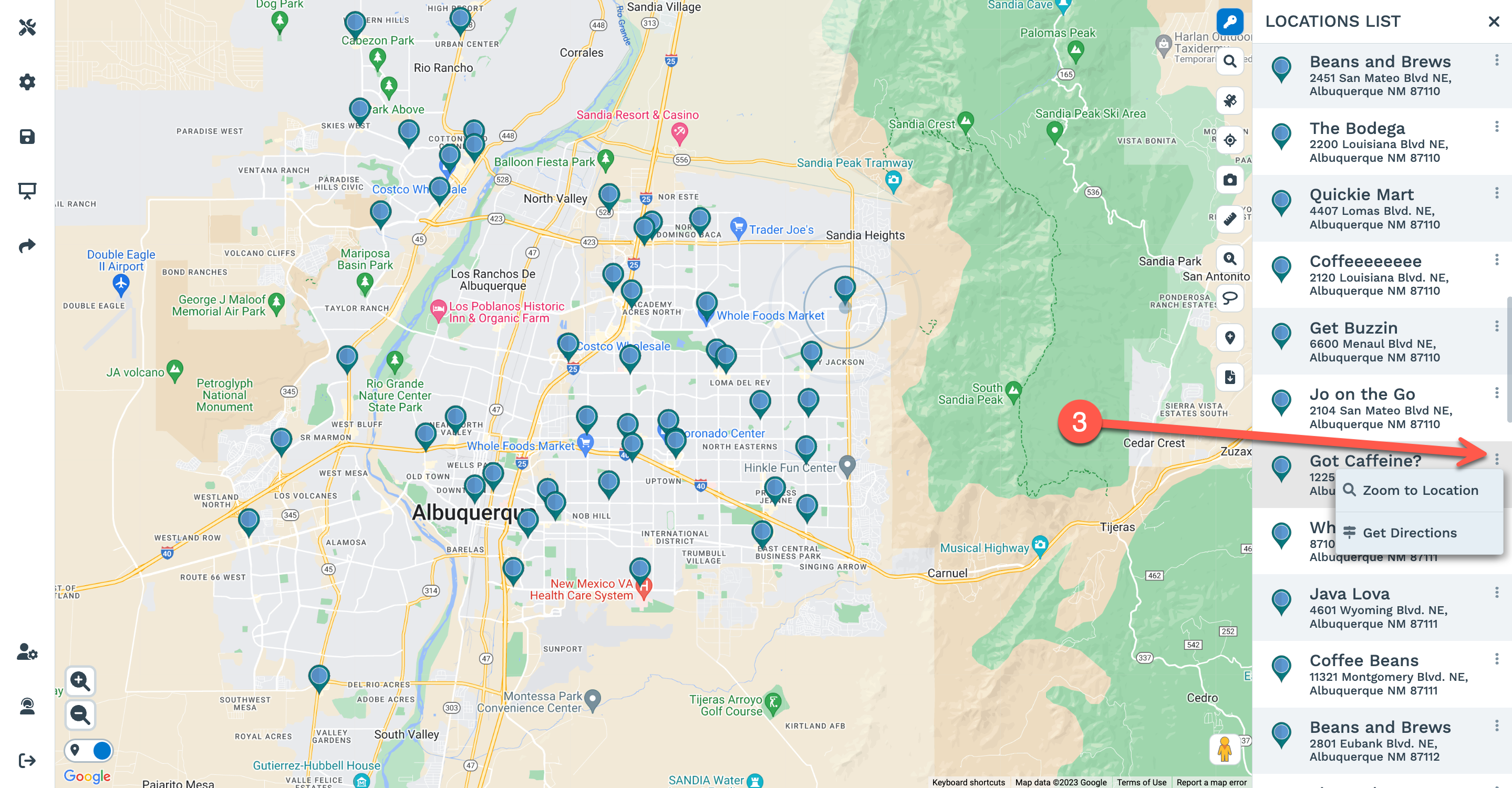 Step 3: Click on the kebab menu (3 dots) next to each location to view options for zooming in on the location and getting directions.