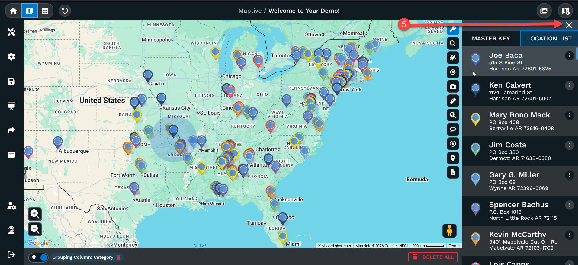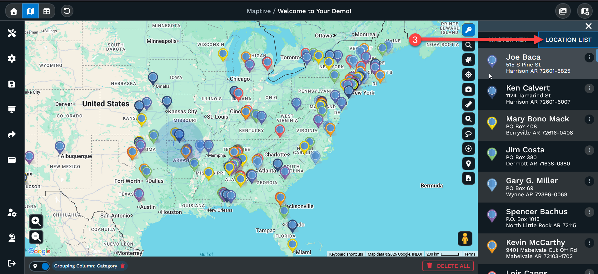 Step 3: Click on the Location List tab to see a list of visible locations on your map. Hovering on one of the names on the list will indicate that location on the map (represented by the blue circle)