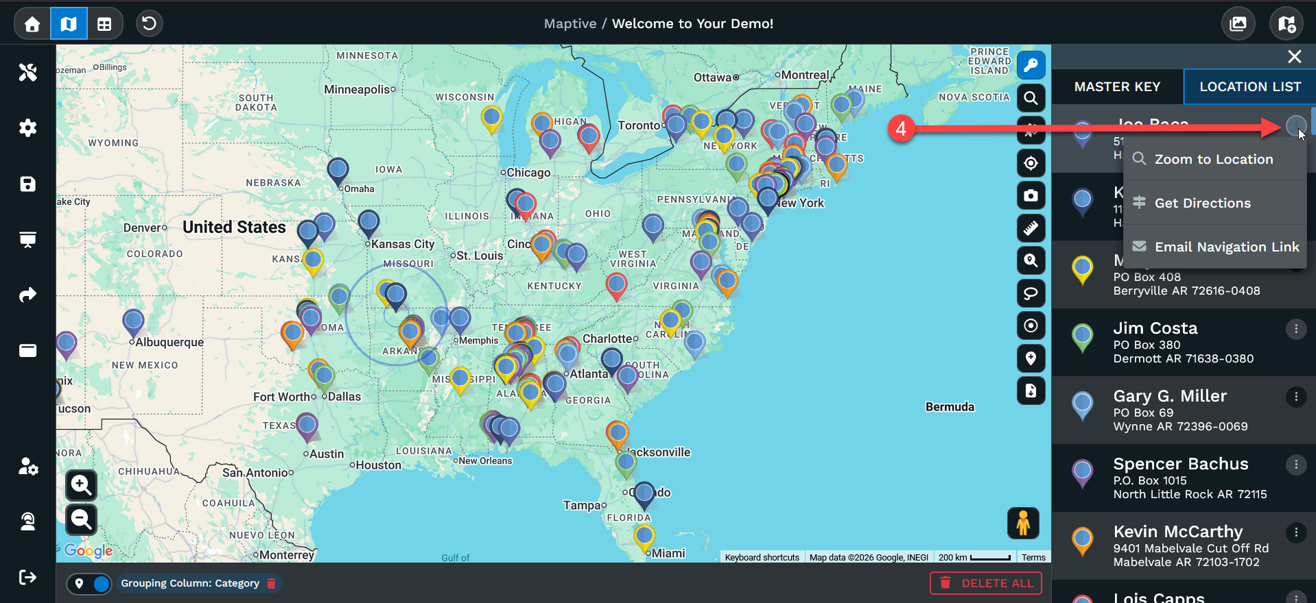 Step 4: Click the three dots in each name listing to Zoom to Location, Get Directions or Email the Navigation Link to yourself or someone else.