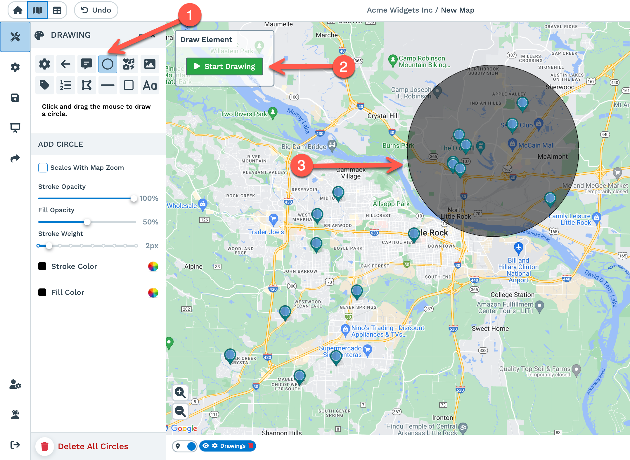 4. Draw Circle: Allows you to draw circles on your map. (Please note, these are just drawings no data can be extracted with these circles. If you need data, please see Radius Tool)