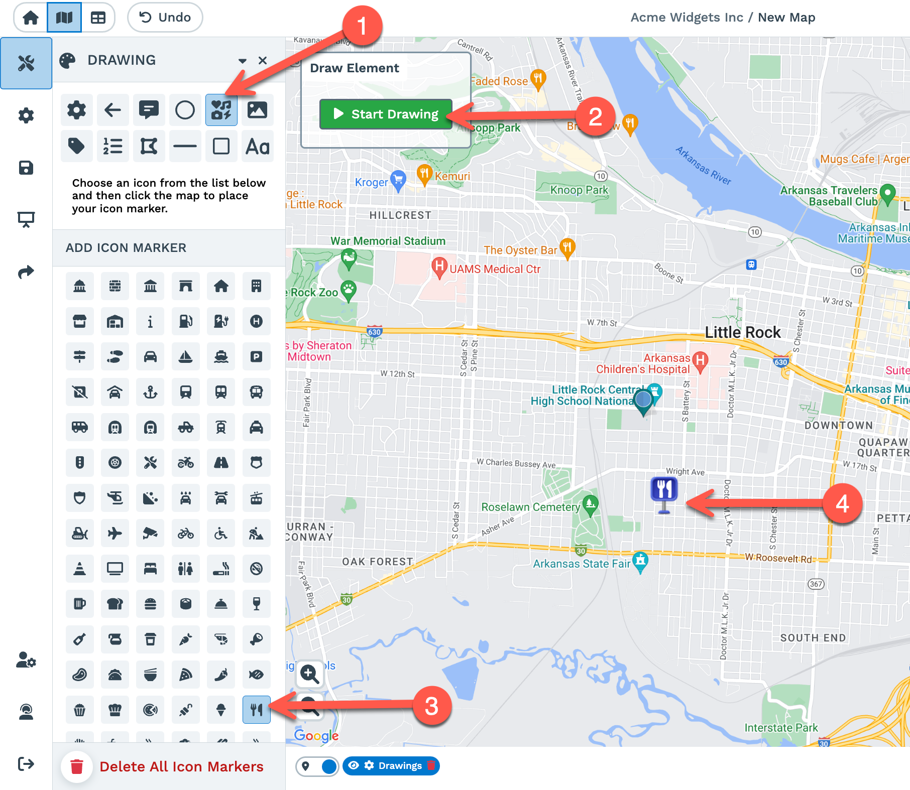 To use the Icon Marker Tool, first select the tool from the list of options so that it is highlighted. Then click on 'Start Drawing' to begin.