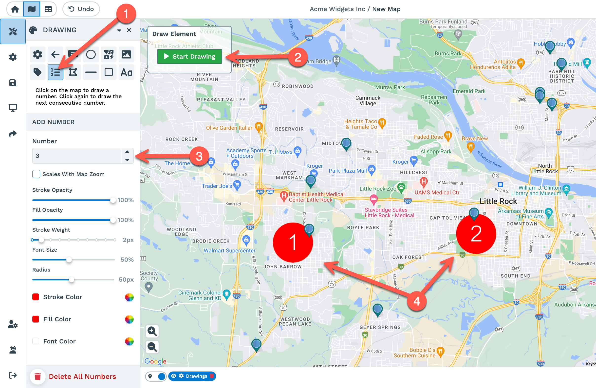 To move the bubbled number, click 'Pause Drawing,' then, you can move the number anywhere on your map by clicking and dragging. Adjust the size of your bubbled number by clicking and dragging the small circles on the numbered bubble, or you can adjust the 'Radius' from the Edit Number Tool panel.