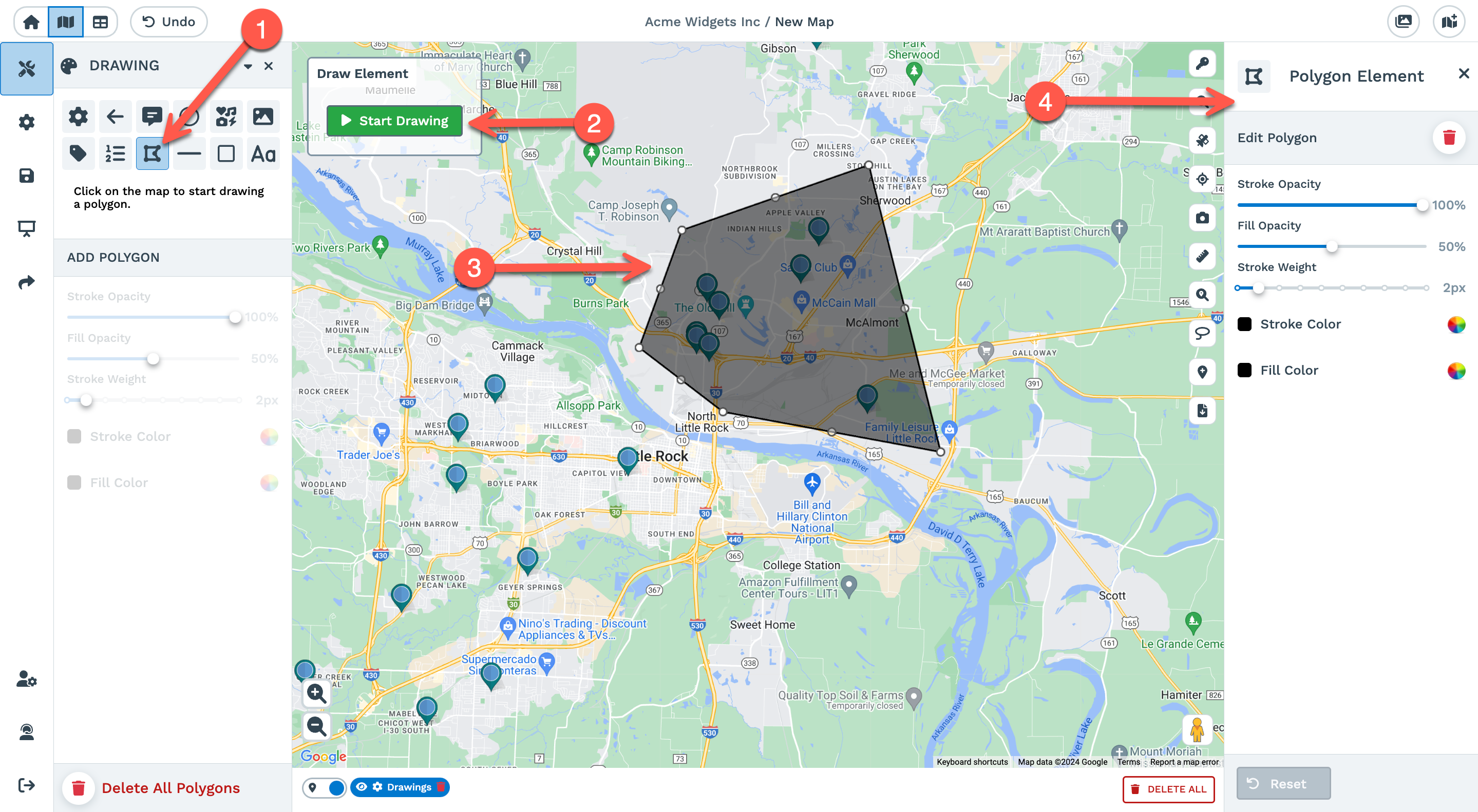 You can select 'Pause Drawing' and 'Resume Drawing' to make edits or adjustments. Click and drag any point in your polygon to adjust the size. You can also adjust the stroke opacity, fill opacity, stroke weight, stroke color, and fill color.