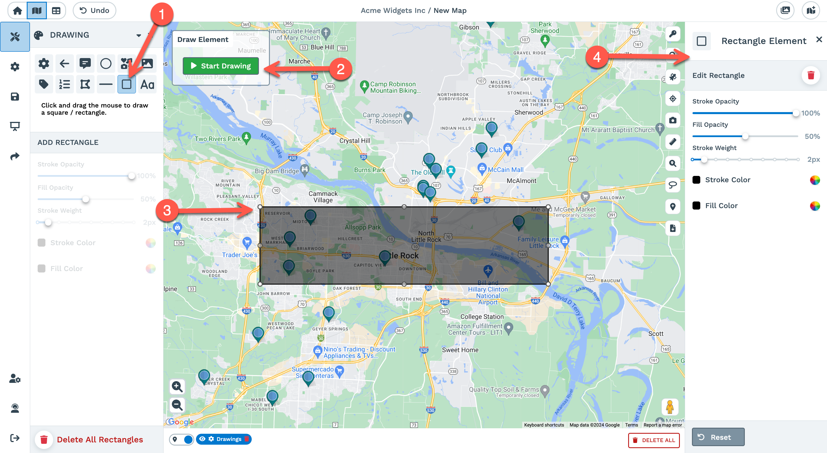 You can select 'Pause Drawing' and 'Resume Drawing' to make edits or adjustments. Click and drag any point in your rectangle to adjust the size. You can also adjust the stroke opacity, fill opacity, stroke weight, stroke color, and fill color.