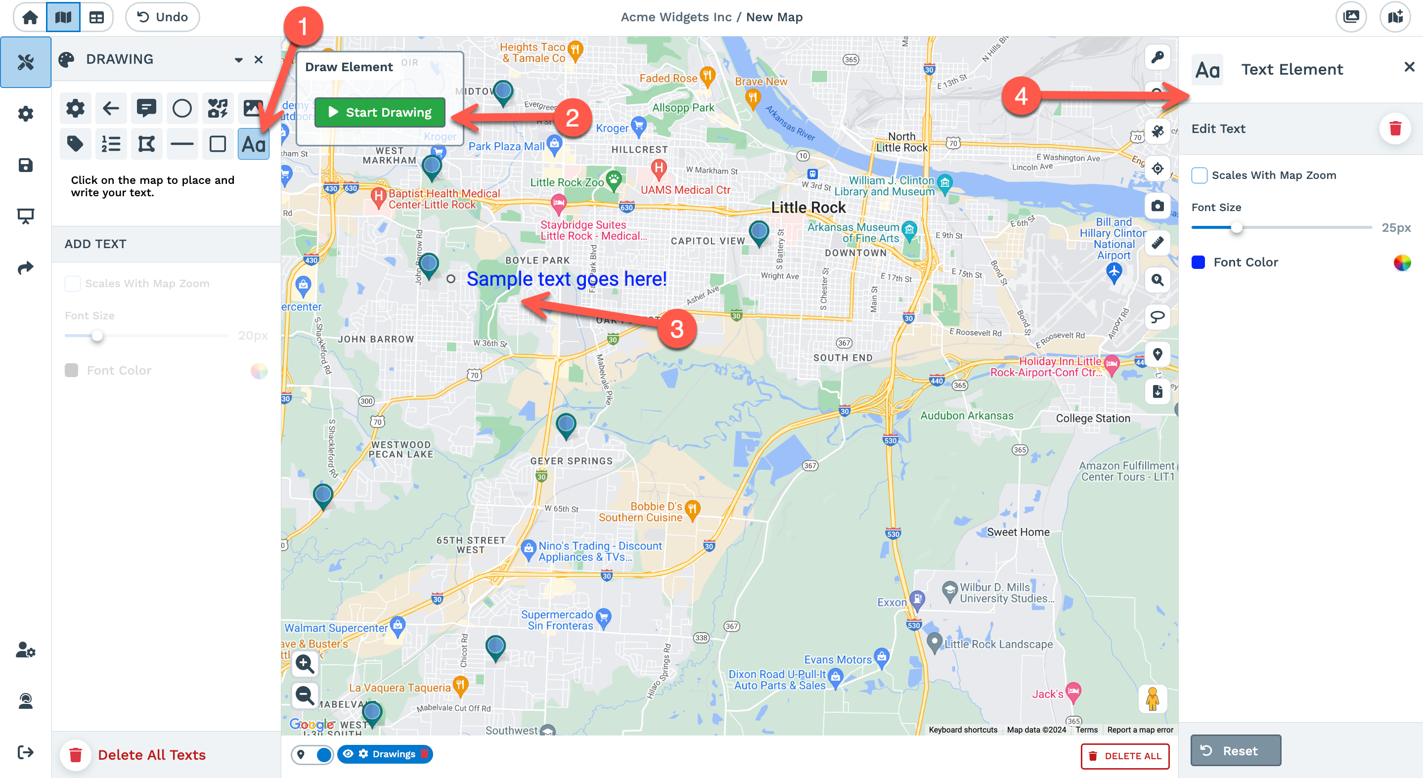You can select 'Pause Drawing' and 'Resume Drawing' to make edits or adjustments. You can customize the text and move it anywhere on your map by clicking and dragging the dot. You can also adjust the font size and font color.