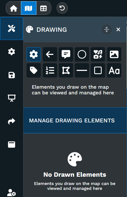 The Manage Drawing Elements tool is the tool you will select when you want to move around your map (think of it as your cursor) or manage the elements used in the map.