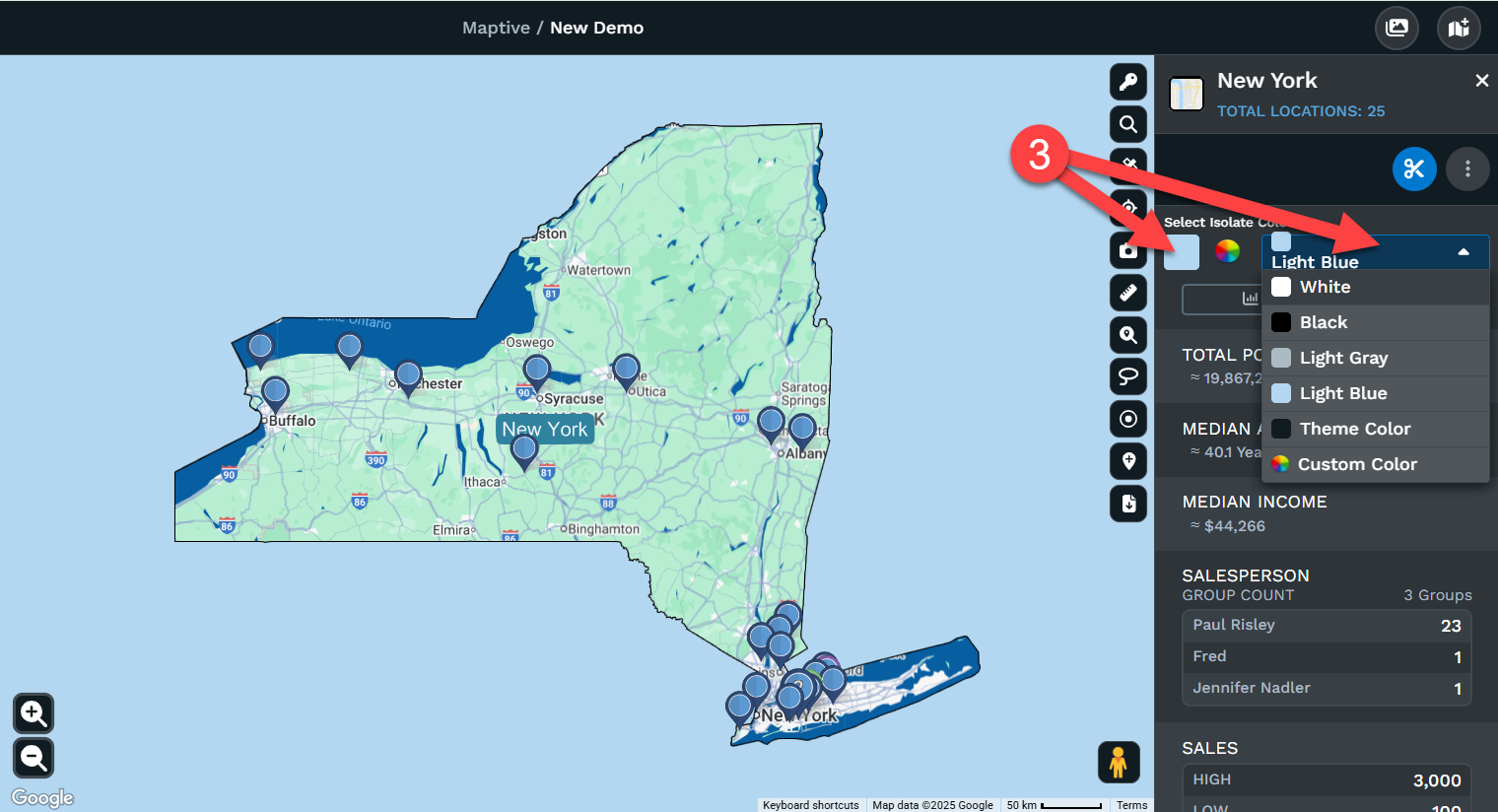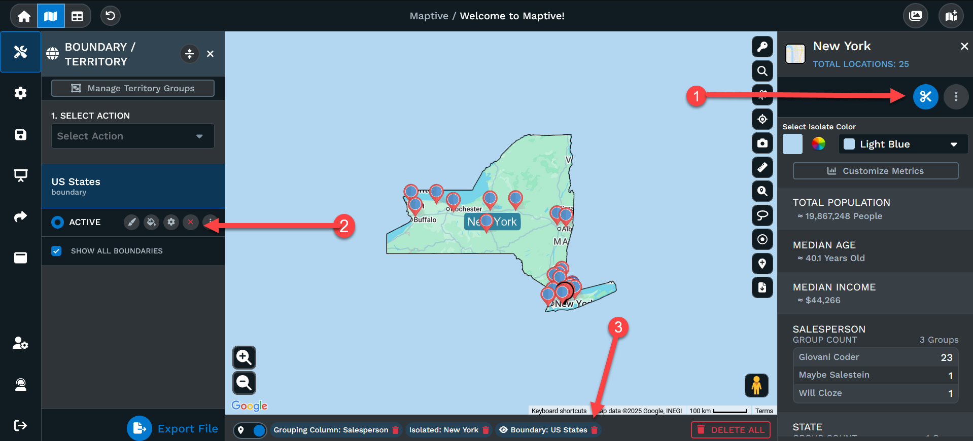 The Isolate tool allows you to isolate one boundary or territory at a time. If you need to show multiple boundaries such as two or more states you would first need to create a territory using the states you want to isolate.