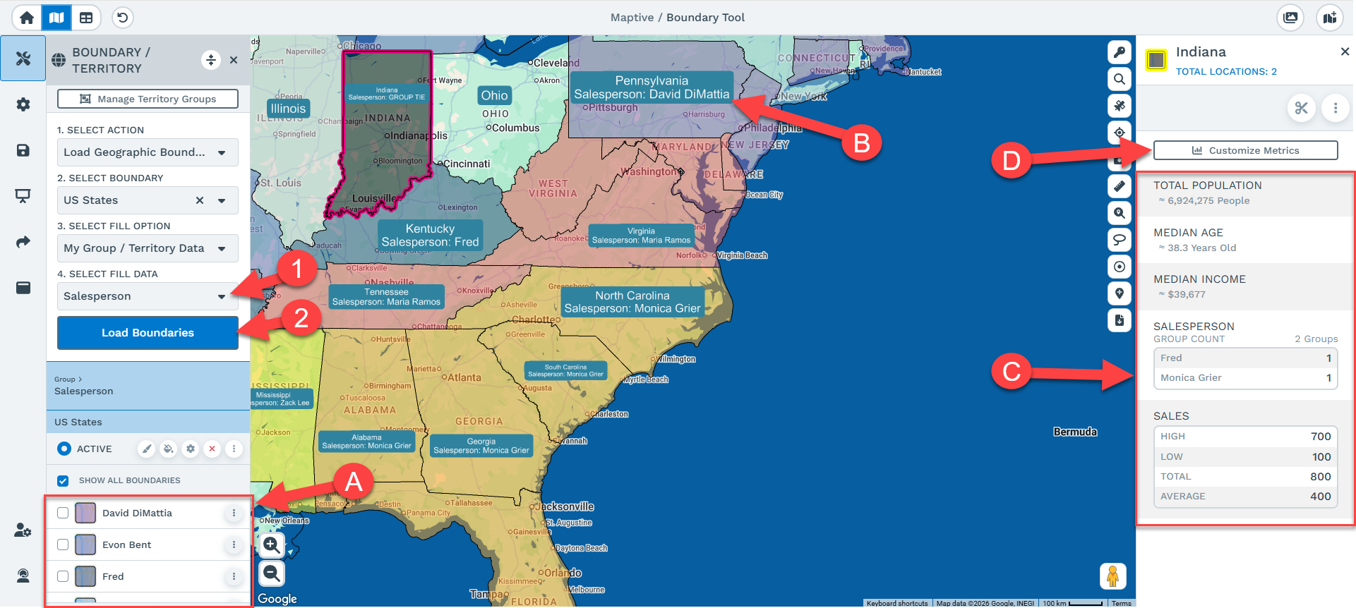 The boundaries will then get added to the map and will be colored based whichever unique value has the most markers in a boundary. A key (A) will get added showing every unique value that is assigned to at least one boundary. The Boundaries themselves will display the boundary name and the unique value (B). When you click on a boundary some metrics will automatically be included (C). they can be customized by clicking (D)