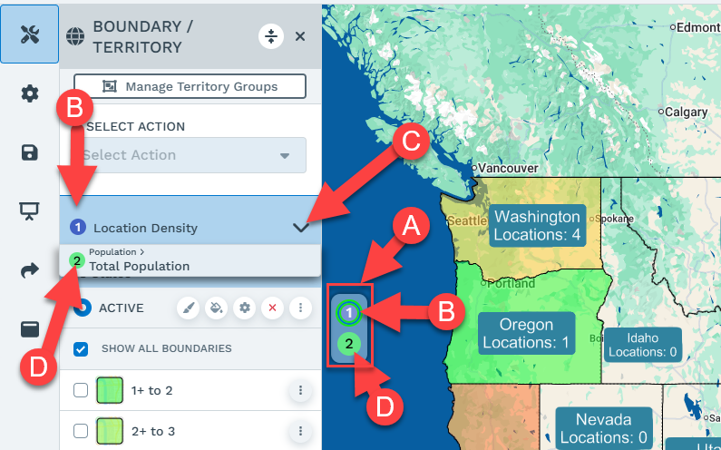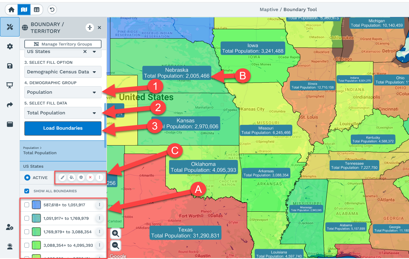 The boundaries will then get added to the map and will be colored based on the metric you selected. A key (A) will get added showing you the numeric ranges of the metric. In this case Total US Population. The Boundaries themselves will display the boundary name and the total value for the boundary. You can customize the key and what shows in the boundaries using the action (C). These actions will be described later in the tutorial