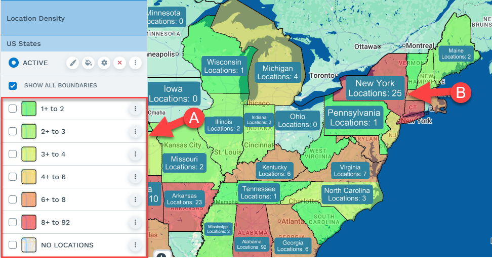 The boundaries will then get added to the map and will be colored based on the number of locations. A key (A) will get added showing you the marker count range for each color. The Boundaries themselves will display the boundary name and the total count for the boundary (B).