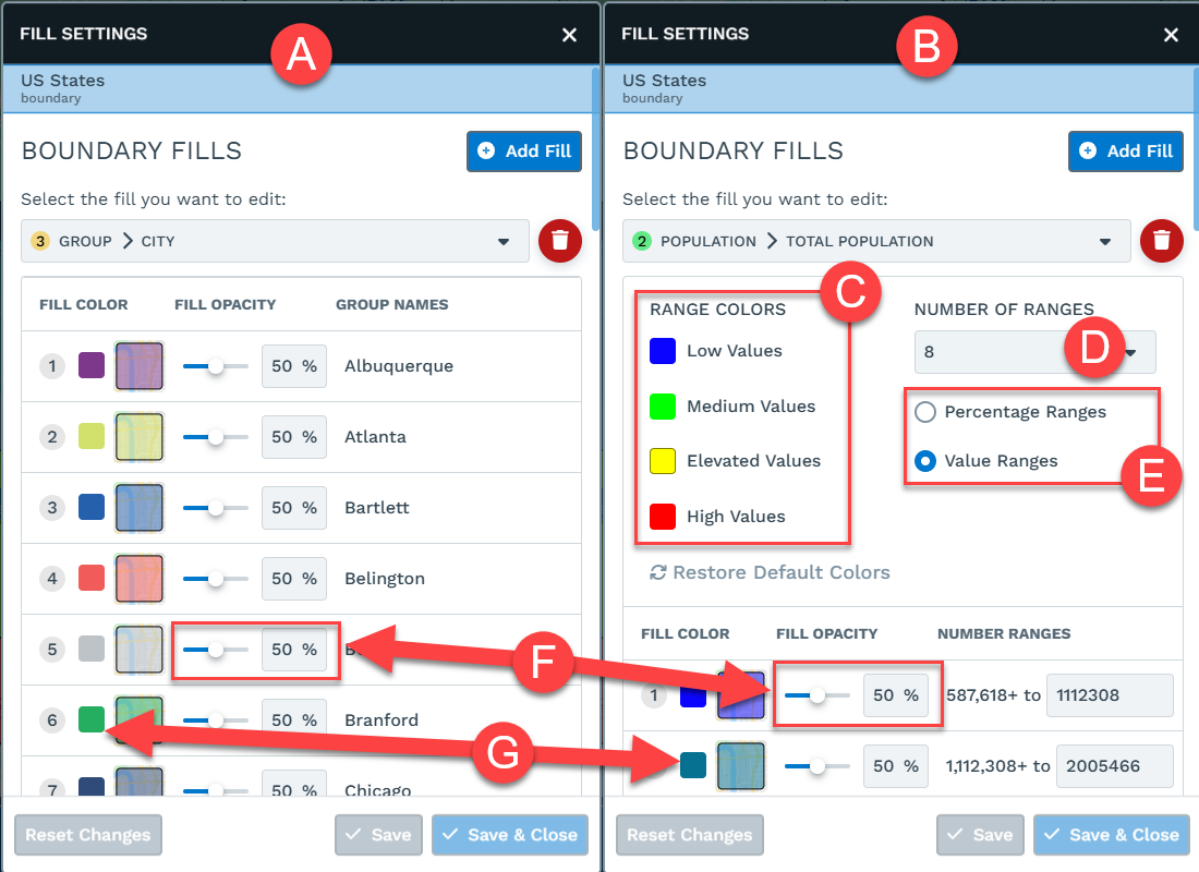 There are two versions of Fill Settings. One (A) displays for group/territory data, and another (B) displays for all other numeric based fills. For numeric fills there is a default color progression (C) which is used to calculate the individual colors of the numeric ranges. You can change these colors to affect the spectrum of the colors calculated below. You can also change how many ranges your numeric ranges will be separated into (D) and how the numeric ranges will be calculated (E). By default that are calculated with Value Ranges which will try to select the ranges so that an equal number of boundaries fall into each range, this usually creates the best looking maps. The other option Percentage Ranges will split the ranges equally based on the high and low value. This can mean that some ranges might not have any data in them at all