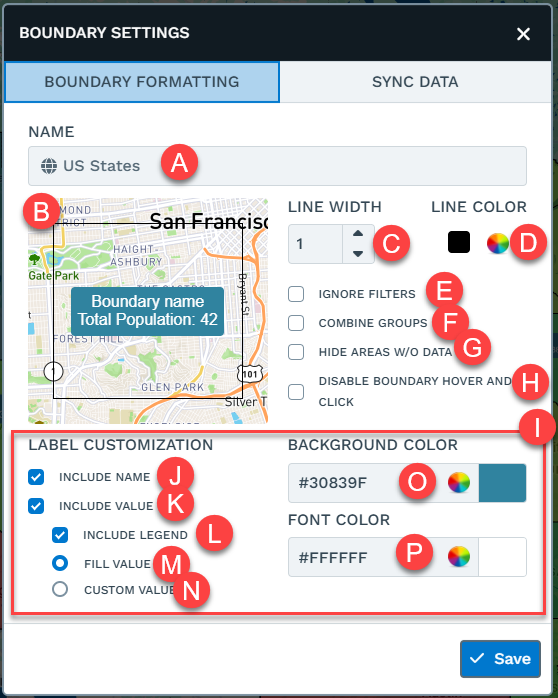 When you open the boundary settings popup it will start on Boundary Formatting this is where you can control how the boundaries appear, how you can interact with them on the map, and what the labels will include. It will also show you the name of the boundary set you are currently looking at (A) and a preview of what the border and label will look like (B).