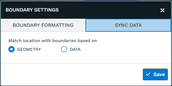 The Sync Data tab allows you to set how the boundaries get connected to your data. By default they are set to Geometry which means the system will check which boundary the marker actually falls into. The other option in Data with this option you choose a column(s) in your data and it will connect to the boundaries based on a text match with your data. For instance if you have State Boundaries on your map and a row has California in the state column the system will know that marker is in California. The Data option is best to use when mapping boundaries that might not geocode under normal circumstances for instance census track numbers, or if you don't have complete address data.